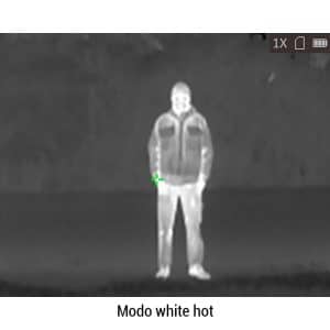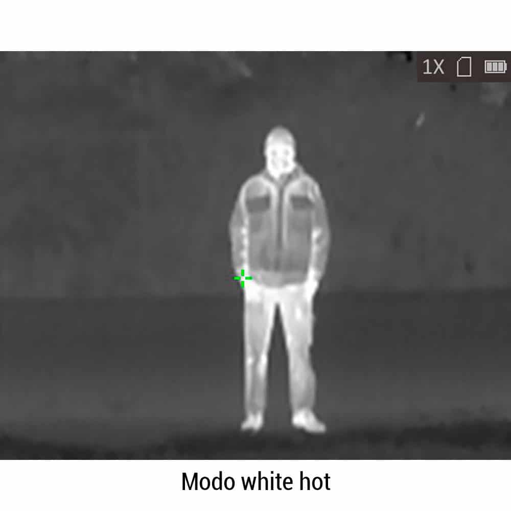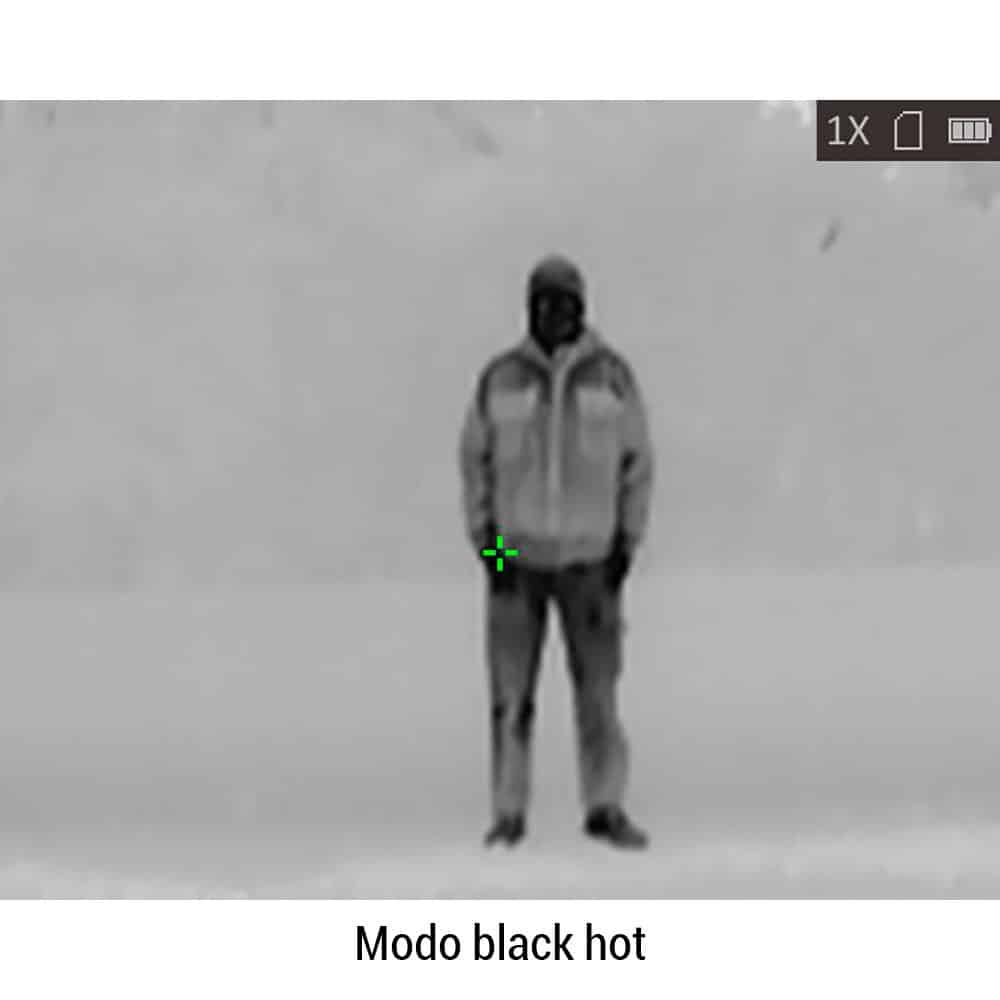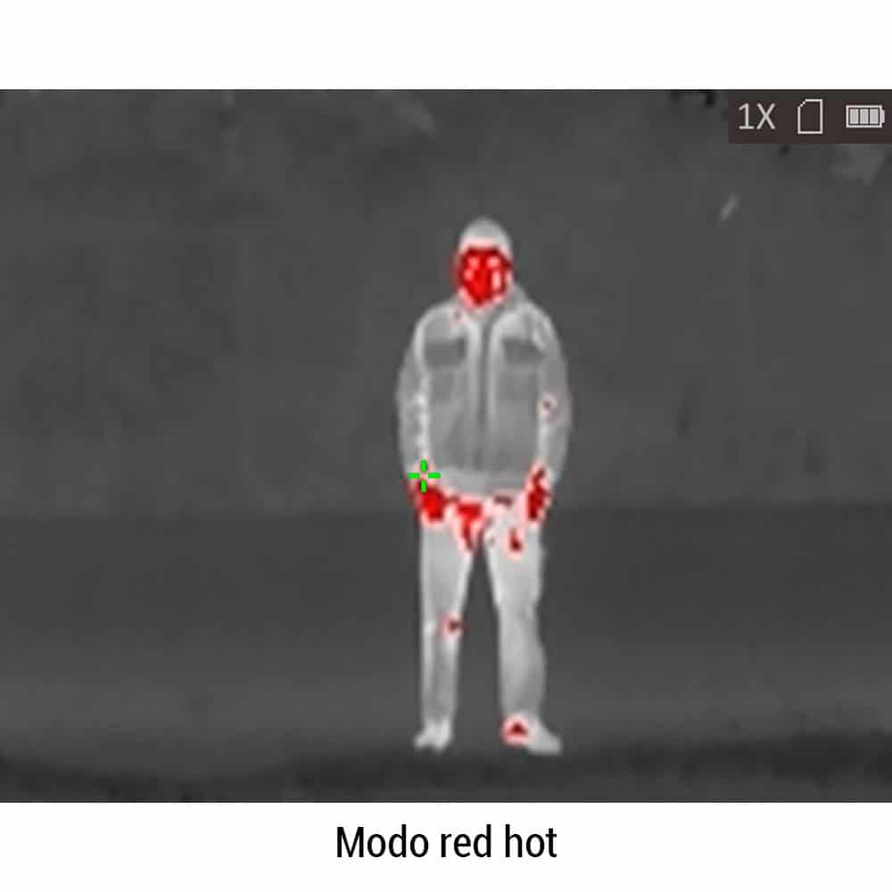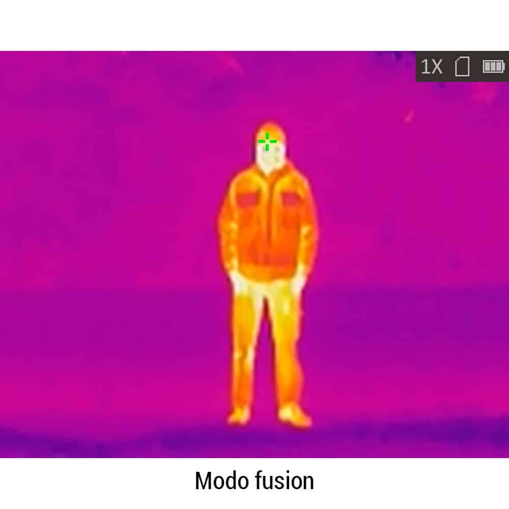 - 4 modos de visualización: fusión (Imagen infrarroja), red hot (imagen en blanco y negro con zonas cálidas resaltadas en rojo), white hot (imagen en blanco y negro con zonas cálidas resaltadas en blanco), black hot (imagen en blanco y negro con zonas cálidas resaltadas en negro)