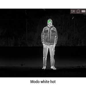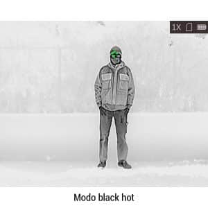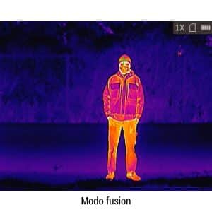 - 4 modos de visualización: fusión (Imagen infrarroja), red hot (imagen en blanco y negro con zonas cálidas resaltadas en rojo), white hot (imagen en blanco y negro con zonas cálidas resaltadas en blanco), black hot (imagen en blanco y negro con zonas cálidas resaltadas en negro)